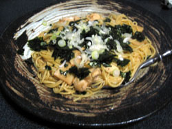 ソース作ってる間にパスタは茹でておけば、ソース出来上がりくらいに、パスタも茹で上がってるので、パスタとからめて、刻み海苔とスライスしたネギを上に散らして出来上がりです。